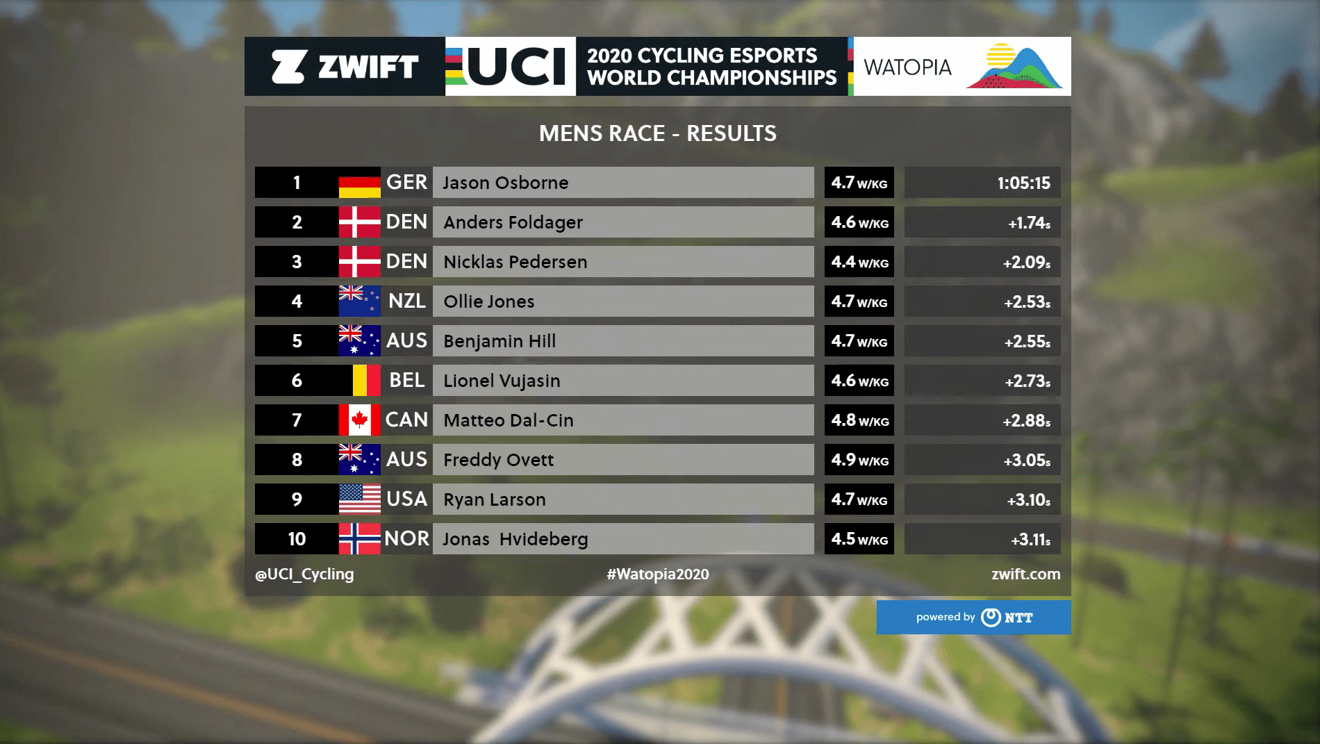 If you missed the race yesterday then you can watch all the highlight below or the full replay here. Whilst many riders either got shedded on the climbs or due to dropouts, all the main action happend on the final climb up to the finish line. We can also recommend the Zwift Community Live post-race review which you can watch here.