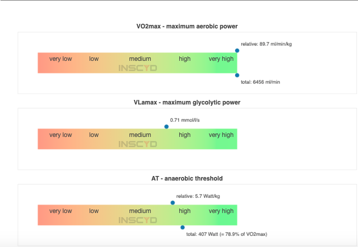 All the riders had high measurements in terms of anaerobic capacities. However, this was to be expected as they perform a lot of anaerobic efforts in training and races. What as unexpected was the extremely high output in the 2.5-minute interval of some riders which was only explainable also with very high aerobic abilities. Calculations for some of the riders' VO2max exceeded 90 ml/min/kg (as a reference, the reported "record" in terms of VO2max is 96.7 1 ). Initially, it seemed unlikely, but we re-calculated and tested again. In one case we validated the VO2max with a lab test and measured an 88 ml/min/kg (which was 3% off of the prediction. This figure is within the measuring tolerance of spirometric systems). So these riders are extremely "specialised" to an extent that we wouldn't have considered before.